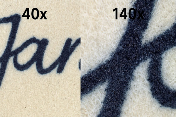 Microscopio Miscope :(arriba), se utiliza para observar la escritura de cerca fotografia macro (140x), la iamgen se ve 140 veces mas grande que a simple vista, tambien tenemos (40x) magnificaciones de mi microscopio, tenemos que el Miscope MP2 permite seleccionar diferentes tipos de iluminacion y filtros opticos para observar como los materiales (tintas, papeles, pigmentos etc) reaccionan bajo distintas longitudes de ondas.